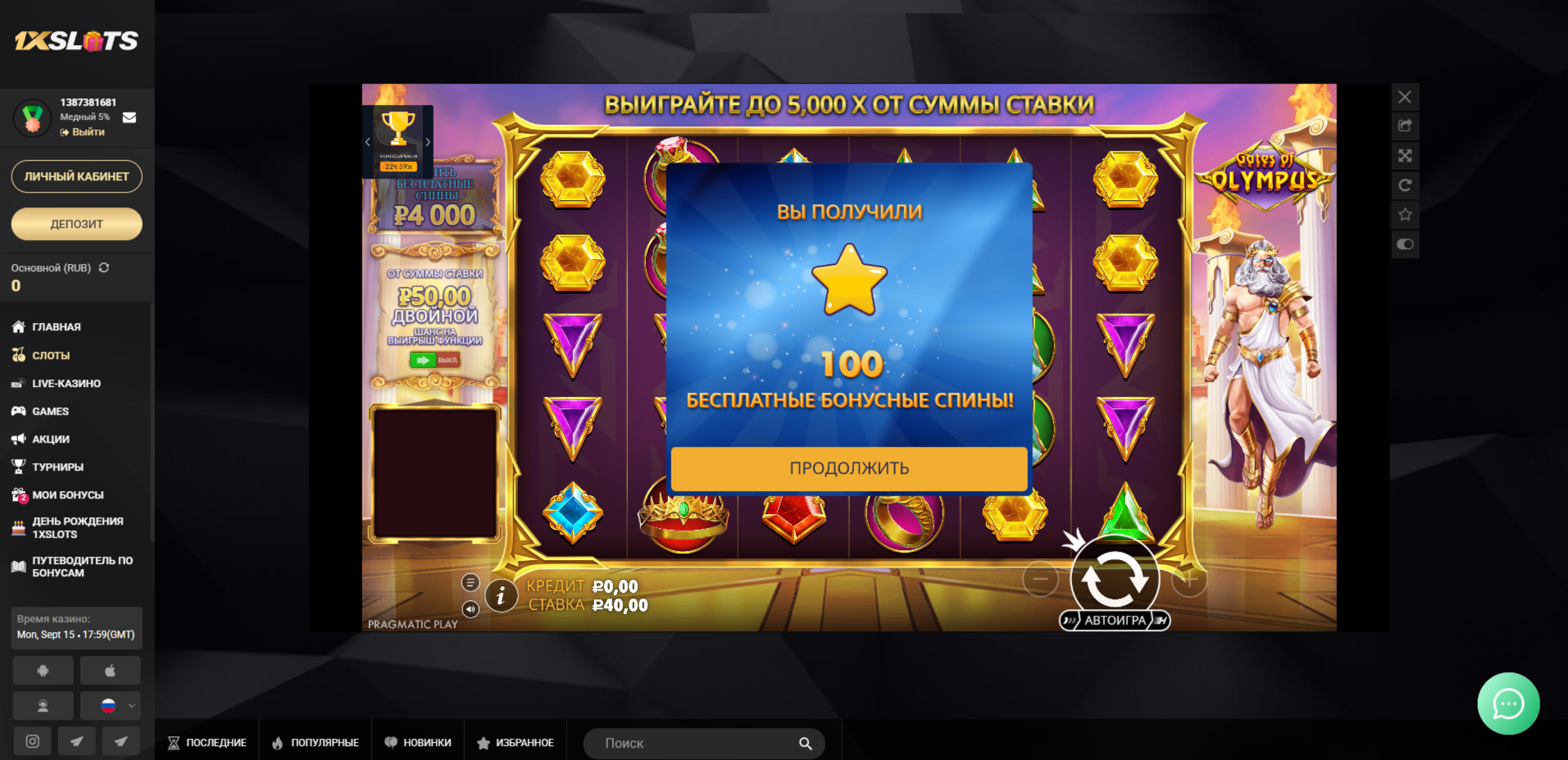 Зарегистрируйтесь на сайте 1xSlots,используя код FREESPINOV100 и получите 100 вращений в легендарном слоте Gates of Olympus от Pragmatic Play,плюс повышенный бонус при депозите.