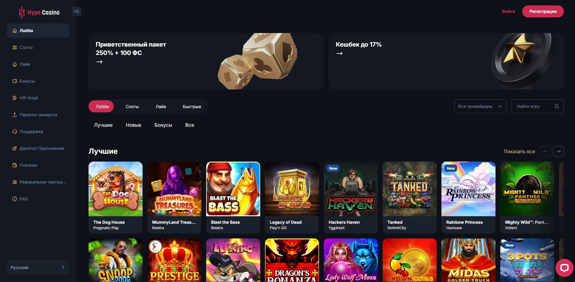 Hype Casino — это современная игровая площадка с быстрыми выплатами и выгодными предложениями для новичков. Главное среди них — бездепозитный бонус за регистрацию: после создания аккаунта игрок получает бесплатные вращения в популярном слоте The Dog House.