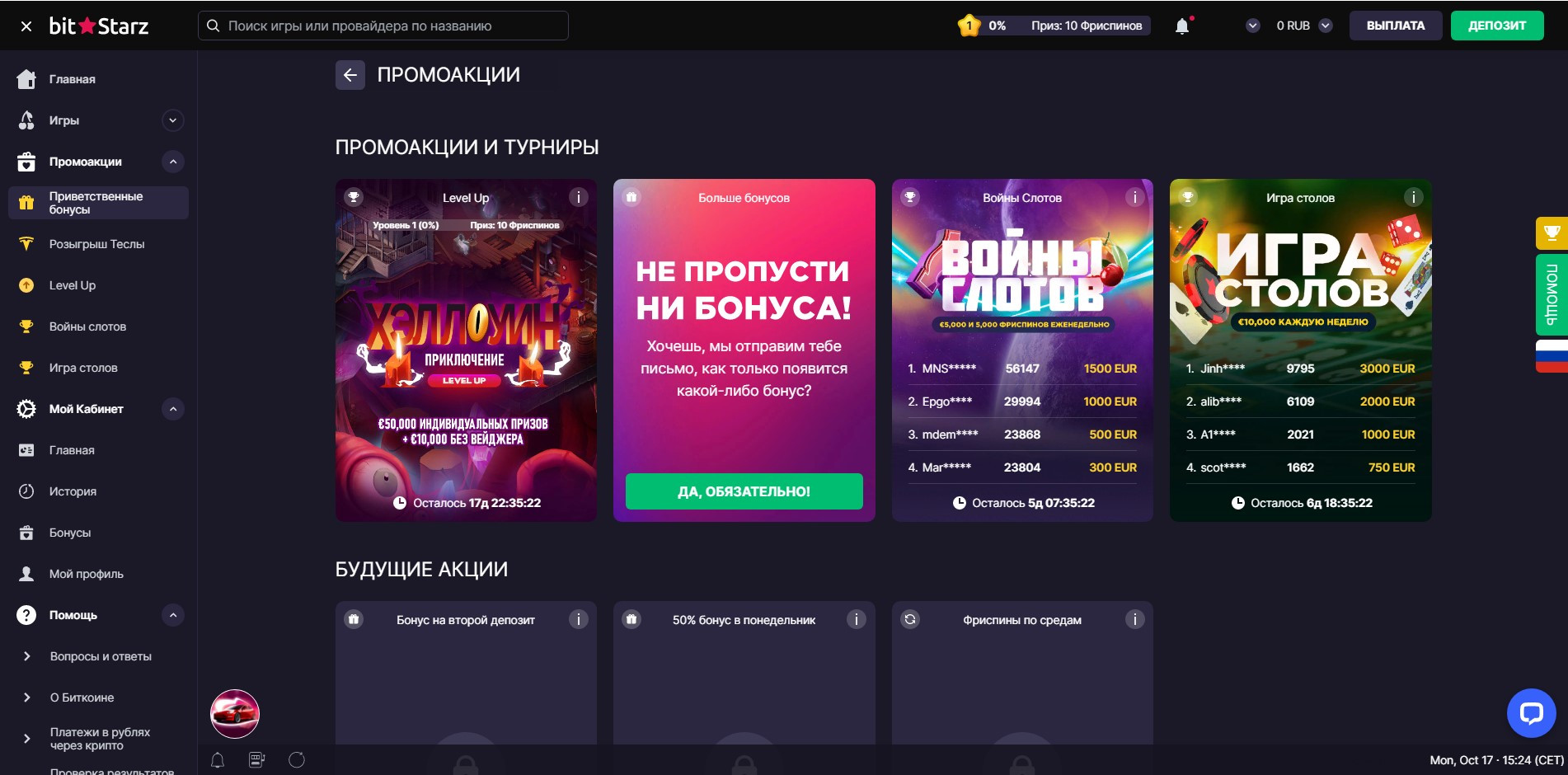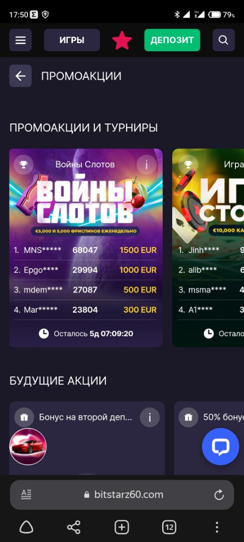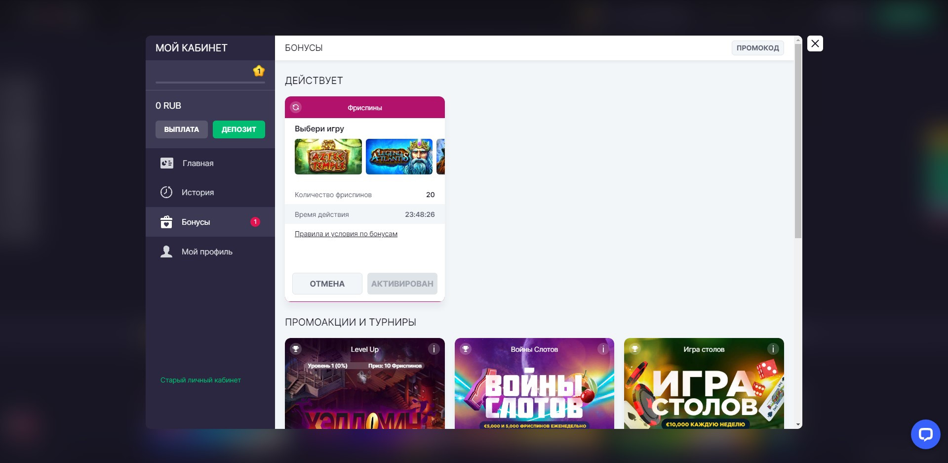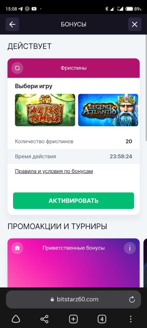 Все бонусные предложения отображаются в разделе «Акции». Здесь можно активировать приветственный пакет, промокоды и участвовать в турнирах.