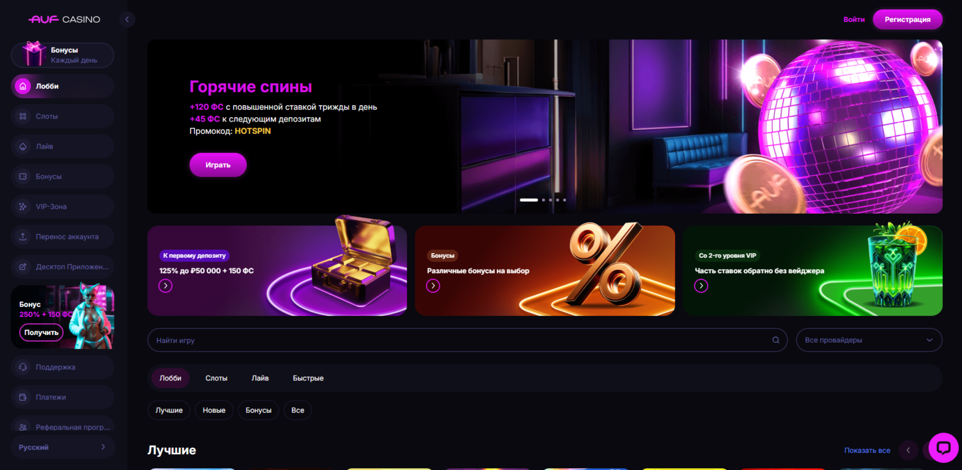 Auf Casino — это онлайн-казино нового формата, где игроков ждут лучшие игровые автоматы, бонусы за регистрацию и быстрые выплаты. Платформа объединяет тысячи слотов, live-игры с реальными дилерами и выгодные акции для новых и постоянных пользователей.