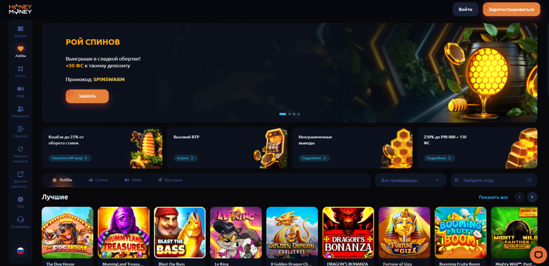 HoneyMoney Casino — современное онлайн-казино, которое привлекает игроков стильным интерфейсом, большим выбором слотов и щедрыми акциями. Новички здесь получают особый подарок — бездепозитный бонус при регистрации.